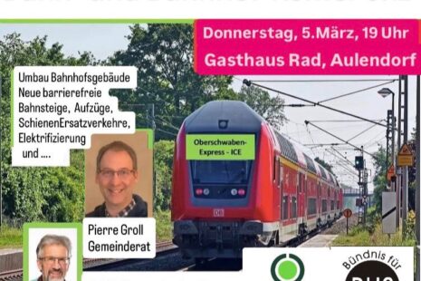 Donnerstag, 5.3.2026, 19 Uhr, Gasthaus Rad Jahrhundert-Maßnahmen am Bahnhof Aulendorf stehen vor der Realisierung. Von 2026 bis 2028 werden die größten Umbaumaßnahmen am Bahnhof Aulendorf umgesetzt. Neue, barrierefreie Gleise mit Aufzügen und ein zusätzlicher Bahnsteig mit 2 Gleisen werden gebaut. Darüber hinaus gibt es sehr viele Veränderungen im Zugverkehr in den Jahren 2026, 2027 bis […]