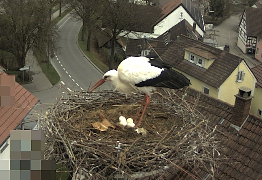 Auf den Stundenbildern vom 29.03.26 ist um 15 Uhr gut zu erkennen, dass es nun vier Eier im Nest sind. Der Schnee und die Kälte sind für die Störche kein Problem, da sie robust sind und Temperaturen bis zu -20 Grad Celsius vertragen. Problematisch ist es nur, wenn es längere Zeit eine geschlossene Schneedecke gibt und die Störche dann keine Nahrung mehr finden. Die Störche können die Eier auch bei Kälte erfolgreich ausbrüten. Solange die Störche die Eier wärmen, besteht keine Gefahr für den Nachwuchs. Auch geschlüpfte Störche passen die ersten vier Wochen noch gut unter das warme Gefieder der Eltern. Sobald sie aber größer werden, geht das nicht mehr. Dann wäre zu viel Kälte und Dauerregen gefährlich für die kleinen Störche.